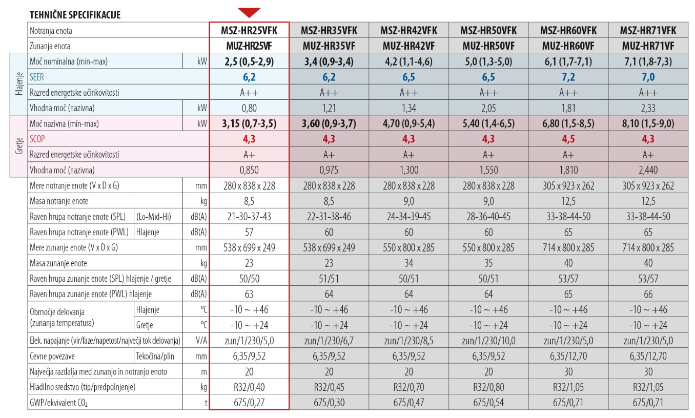 Klimatska naprava serije MSZ-HR predstavlja poceni investicijo v klimatizacijo. Z njo si lahko privoščite kvalitetno osvežitev prostora v vročih poletnih dneh a hkrati tudi poceni dogrevanje v prehodnih sezonah. Je kompaktna in enostavno oblikovana, zato jo lahko umestite v vsak interier. Posebej izpostavljamo, da je višina stenske enote le 28 cm. MSZ-HR je na razpolago v enojni in multi izvedbi. Pri enojni izvedbi so trije modeli, hladilne moči 2.5, 3.5 in 5 kW, pri multi izvedbi pa kombinacije z dvema ali tremi notranjimi enotami, dvojčka hladilne moči 4 in 5 kW, trojček hladilne moči 5 kW. Delovanje stenskih enot je zelo tiho.