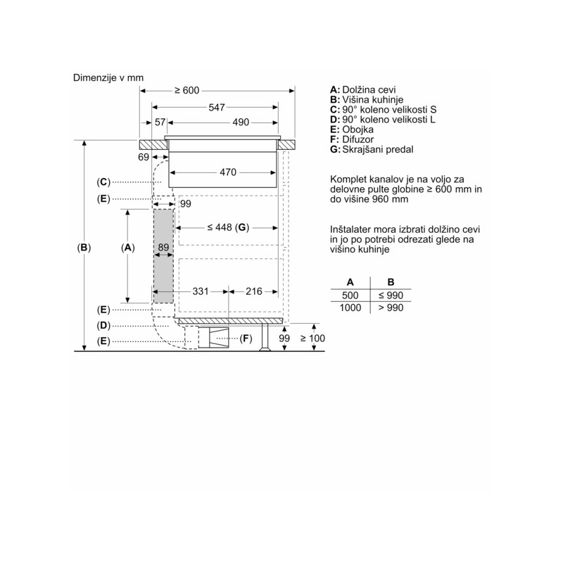 | - Pod kuhalno ploščo z vgrajenim dvižnim prezračevalnim sistemom ni treba namestiti vmesnega dna. Predali in/ali police v talni enoti morajo biti snemljivi. Zadnjo ploščo talne enote se lahko ohrani - potreben je le izrez za izpust zraka (položaj in velikost sta navedena v navodilih za namestitev). |