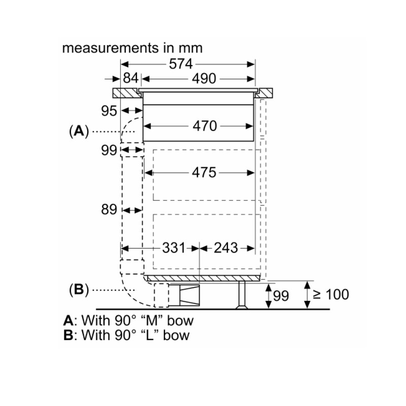 - Aparat mora biti prosto dostopen s spodnje strani (tj. za dostop do spodnjega zbiralnika tekočine). -Pod kuhalno ploščo z vgrajenim dvižnim prezračevalnim sistemom ni treba namestiti vmesnega dna. Predali in/ali police v talni enoti morajo biti snemljivi. Zadnjo ploščo talne enote se lahko ohrani - potreben je le izrez za izpust zraka (položaj in velikost sta navedena v navodilih za namestitev).
